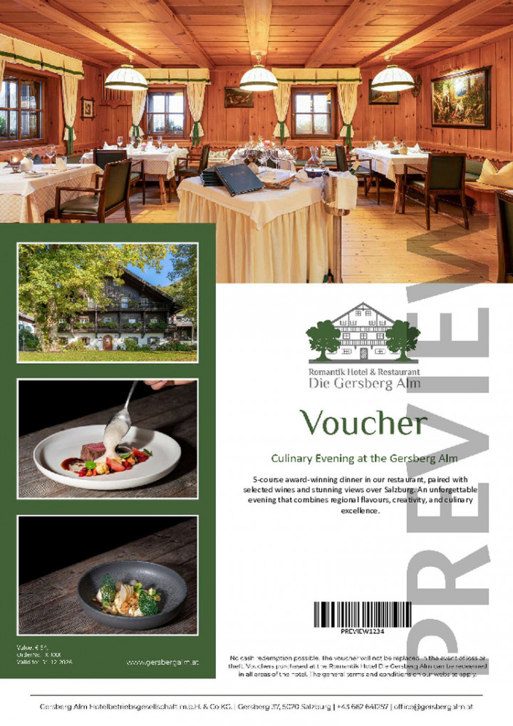 Give the gift of gourmet pleasure: a 5-course award-winning dinner in our restaurant, paired with selected wines and stunning views over Salzburg. An unforgettable evening that combines regional flavours, creativity, and culinary excellence.